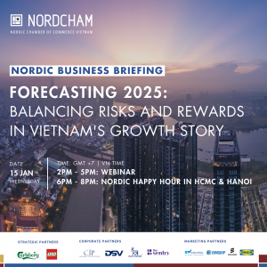 Forecasting 2025: Balancing Risks and Rewards in Vietnam's Growth Story Wednesday, 15 January Time: 2:00 PM โ 5:00 PM ABOUT Nordic Business Briefing Join us for an exclusive Forecasting 2025 where the sharpest minds from the Nordic business community in Vietnam converge to chart the course for 2025. This high-energy session will tackle key themes like navigating economic uncertainties, seizing opportunities in consumer markets, unlocking the potential of technological innovation, driving manufacturing growth, advancing energy transitions, and understanding critical political…