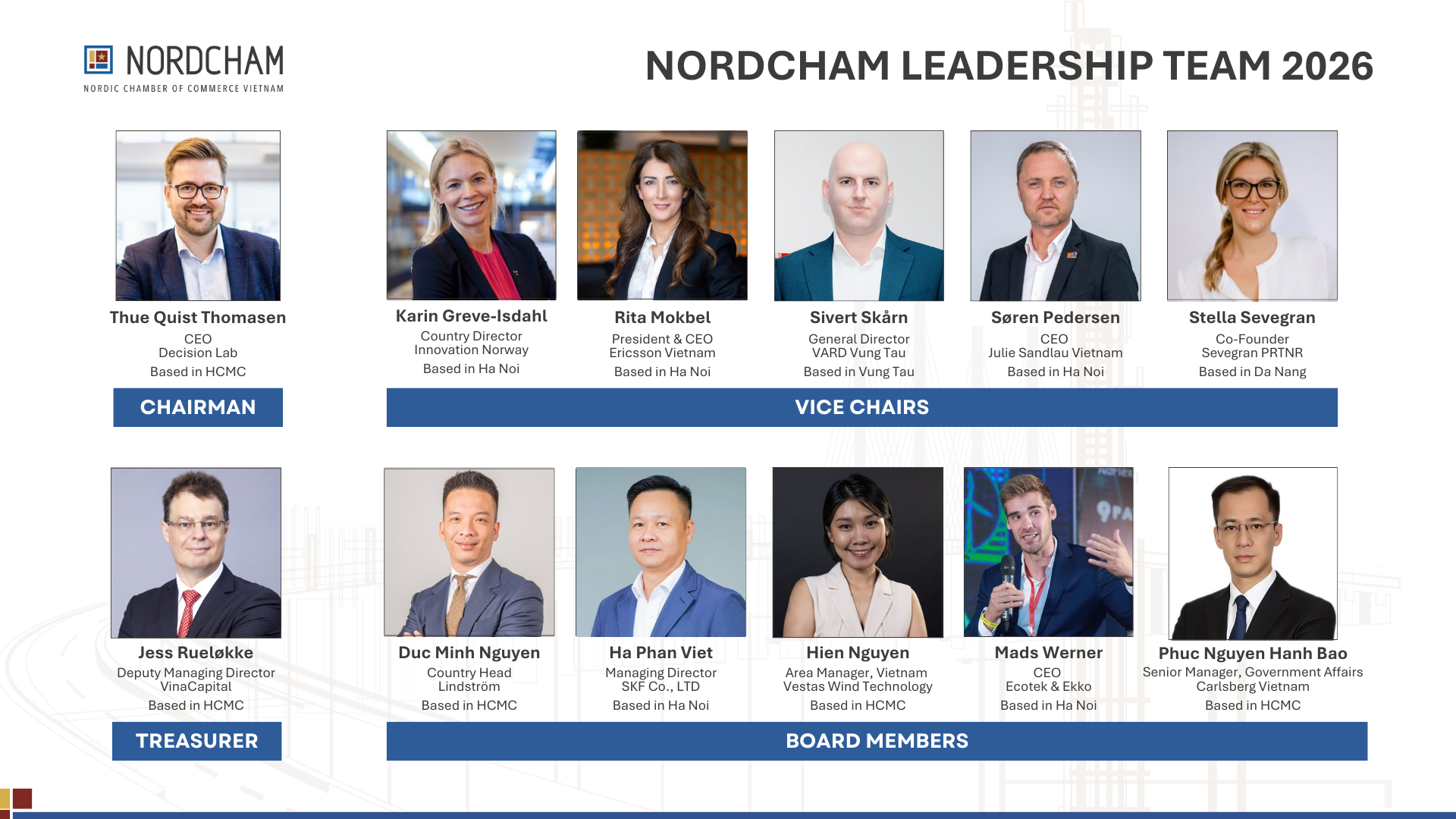 NordCham Vietnam is proud to welcome a leadership team with such extensive experience and diverse expertise. The Chamber is confident that the new Board of Directors will play a key role in strengthening NordCham’s impact and further enhancing collaboration between Nordic businesses and Vietnam in the year ahead.